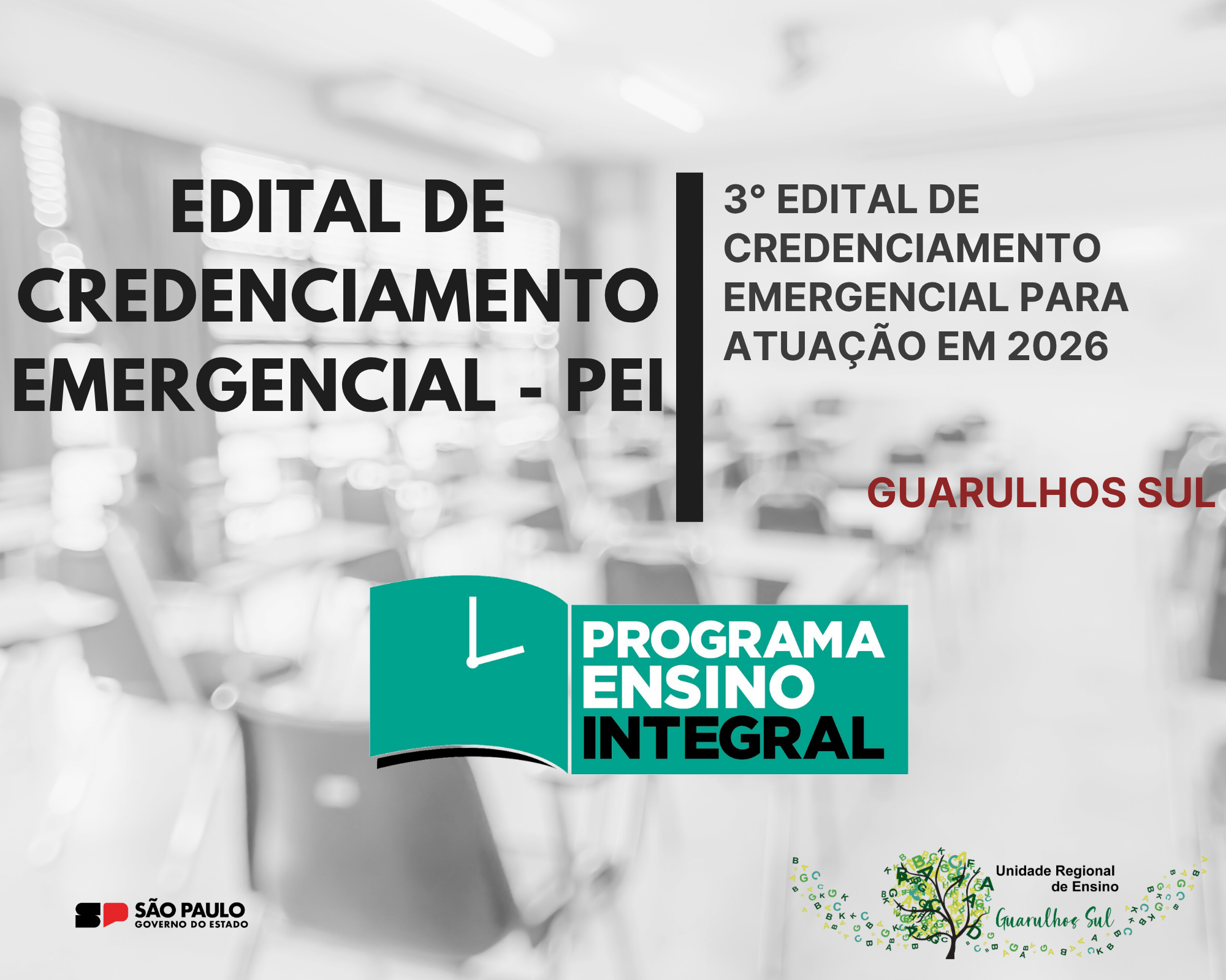 A Unidade Regional de Ensino – Região Guarulhos Sul (URE) torna pública a abertura de inscrições e a realização do Processo de Credenciamento Emergencial para atuação em Regime de Dedicação Exclusiva – RDE, nas escolas estaduais do Programa Ensino Integral, conforme previstos no Decreto nº 66.799, de 31-05-2022, Resolução SEDUC nº 158/2025, Resolução SEDUC 162/2025 e Resolução SEDUC 163/2025 cujo objetivo é o preenchimento de vagas existentes para o ano letivo de 2026.