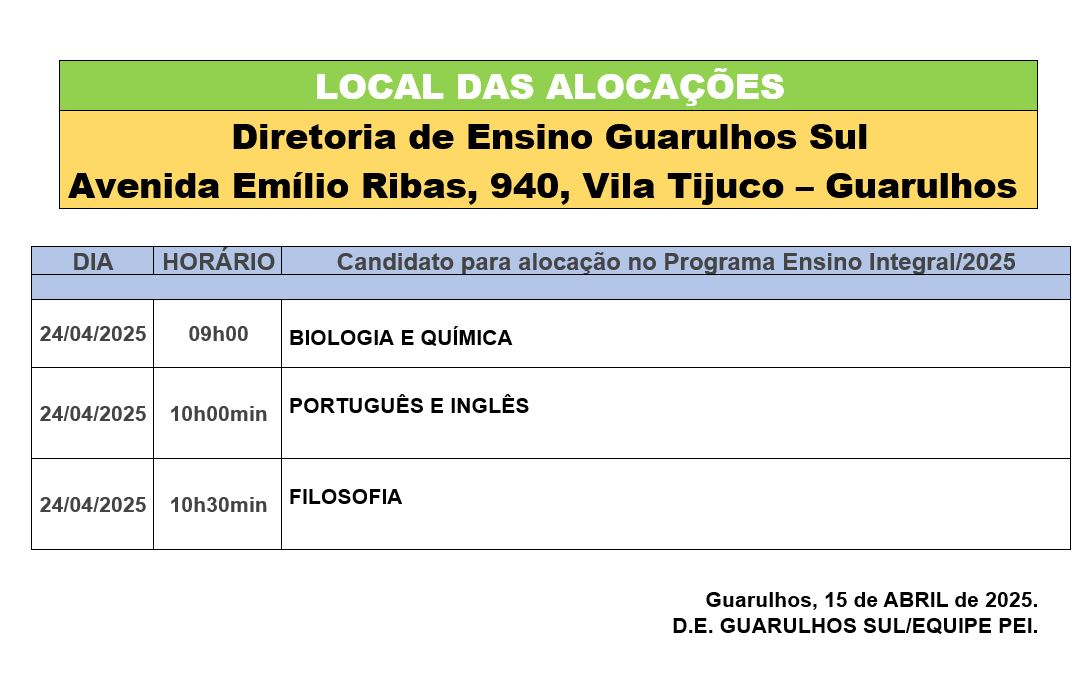 A Dirigente Regional de Ensino, nos termos da Resolução nº 77, de 24/10/2024, Resolução SEDUC nº 95, de 07/11/2024, informa o cronograma de alocação aos candidatos devidamente credenciados/deferidos para as Escolas do Programa Ensino Integral na Diretoria de Ensino Guarulhos Sul – ano de 2025, que indicaram a DIRETORIA DE ENSINO GUARULHOS SUL em sua inscrição docente ou realizaram o 1º Credenciamento Emergencial do PEI desta Diretoria de Ensino.