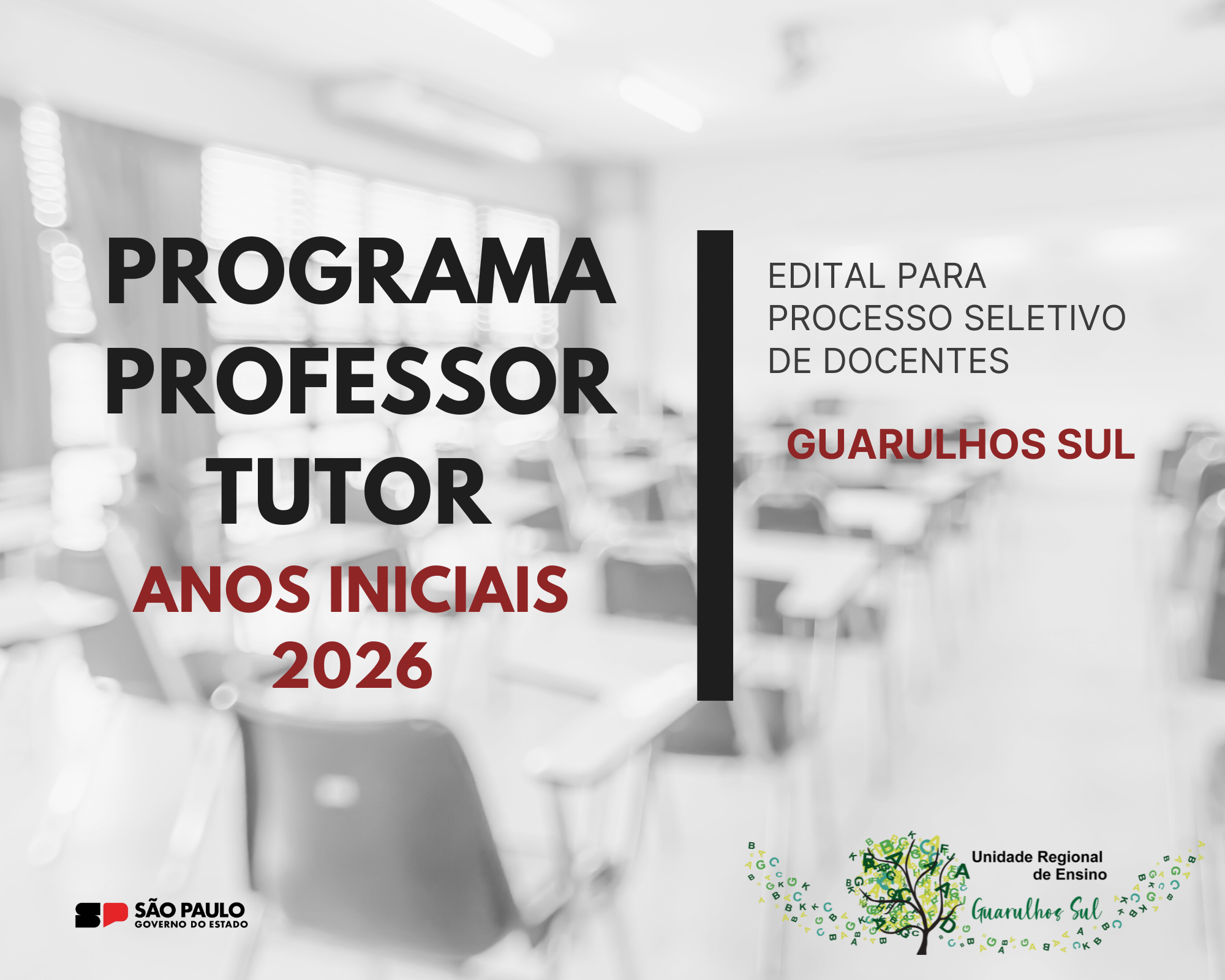A Unidade Regional de Ensino (URE) Região Guarulhos Sul, localizada na Av. Emilio Ribas, 940 – Jd. Tijuco – Guarulhos/SP, em consonância com a Resolução SEDUC Nº 2, de 9 de janeiro de 2026, que institui o Programa Professor Tutor Anos Iniciais no âmbito da Secretaria da Educação do Estado de São Paulo (SEDUC-SP), e com a Portaria SUPED de 26 de janeiro de 2026, torna público o EDITAL de processo seletivo para a função de Professor Tutor, com vistas ao ano letivo de 2026.