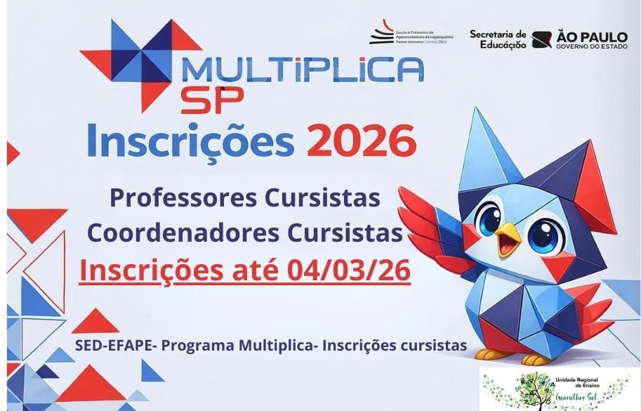 MULTIPLICA – SP – INSCRIÇÕES 2026 26-02-26 Enviar por e-mail LEIA TAMBÉM EDITAL PARA ATRIBUIÇÃO DA EDUCAÇÃO PROFISSIONAL – 2026 – EIXO I – GESTÃO E NEGÓCIOS e EIXO IV – INFORMAÇÃO E COMUNICAÇÃO Relação de inscritos deferidos após análise de recursos – EDITAL 01/2026 – PROCESSO SELETIVO PARA ATRIBUIÇÃO DE AULAS DE PROFESSOR ORIENTADOR DE CONVIVÊNCIA (POC) RESULTADO INICIAL DO EDITAL SELEÇÃO DE PROFESSORES PARA AS ESCOLAS OLÍMPICAS – FEVEREIRO DE 2026 EDITAL PARA SUBSTITUIÇÃO NAS CLASSES DE SUPORTE PEDAGÓGICO – DIRETOR ESCOLAR – EE ZILDA ROMEIRO II