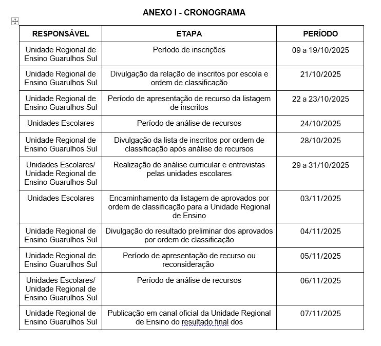 Inscrições: os candidatos deverão se inscrever por meio de canal estabelecido pela Unidade Regional de Ensino Guarulhos Sul https://forms.gle/psJBRJXHAgaUwqgk9